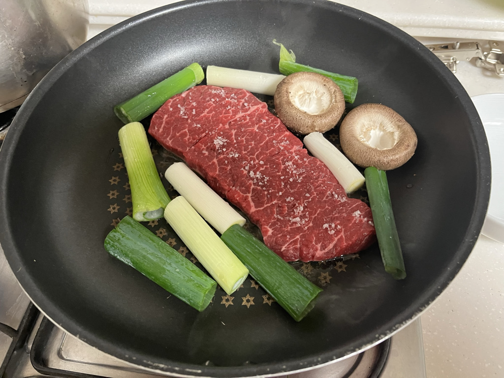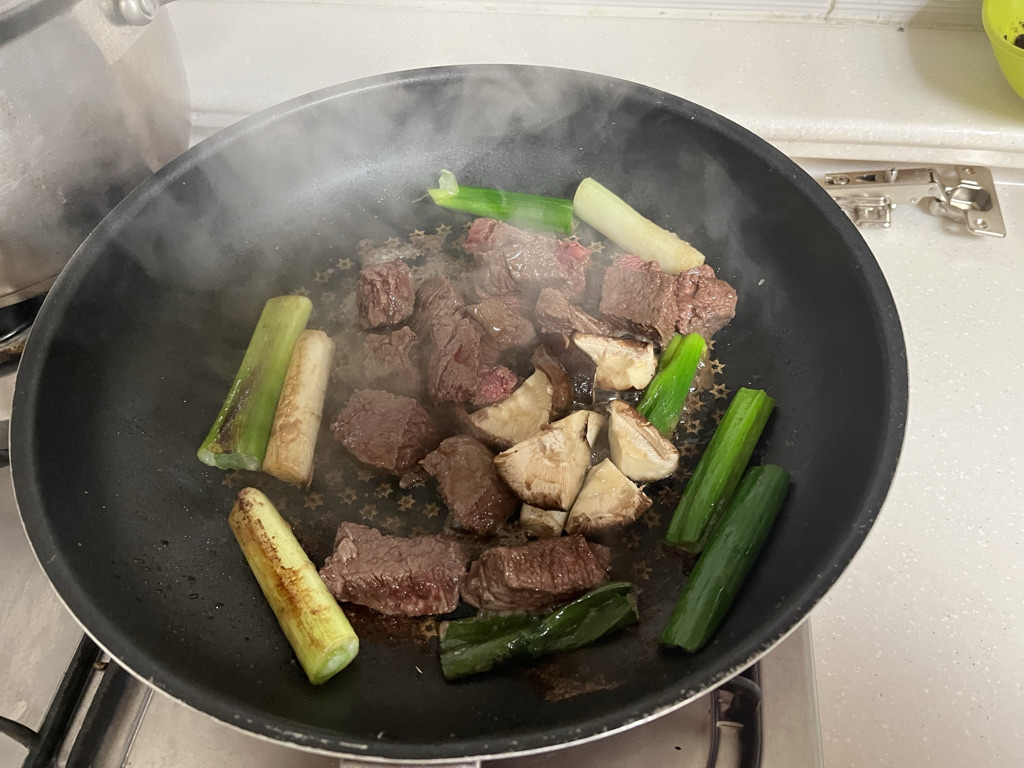 저 팬에 고기와 파 기름이 남아있었는데요.