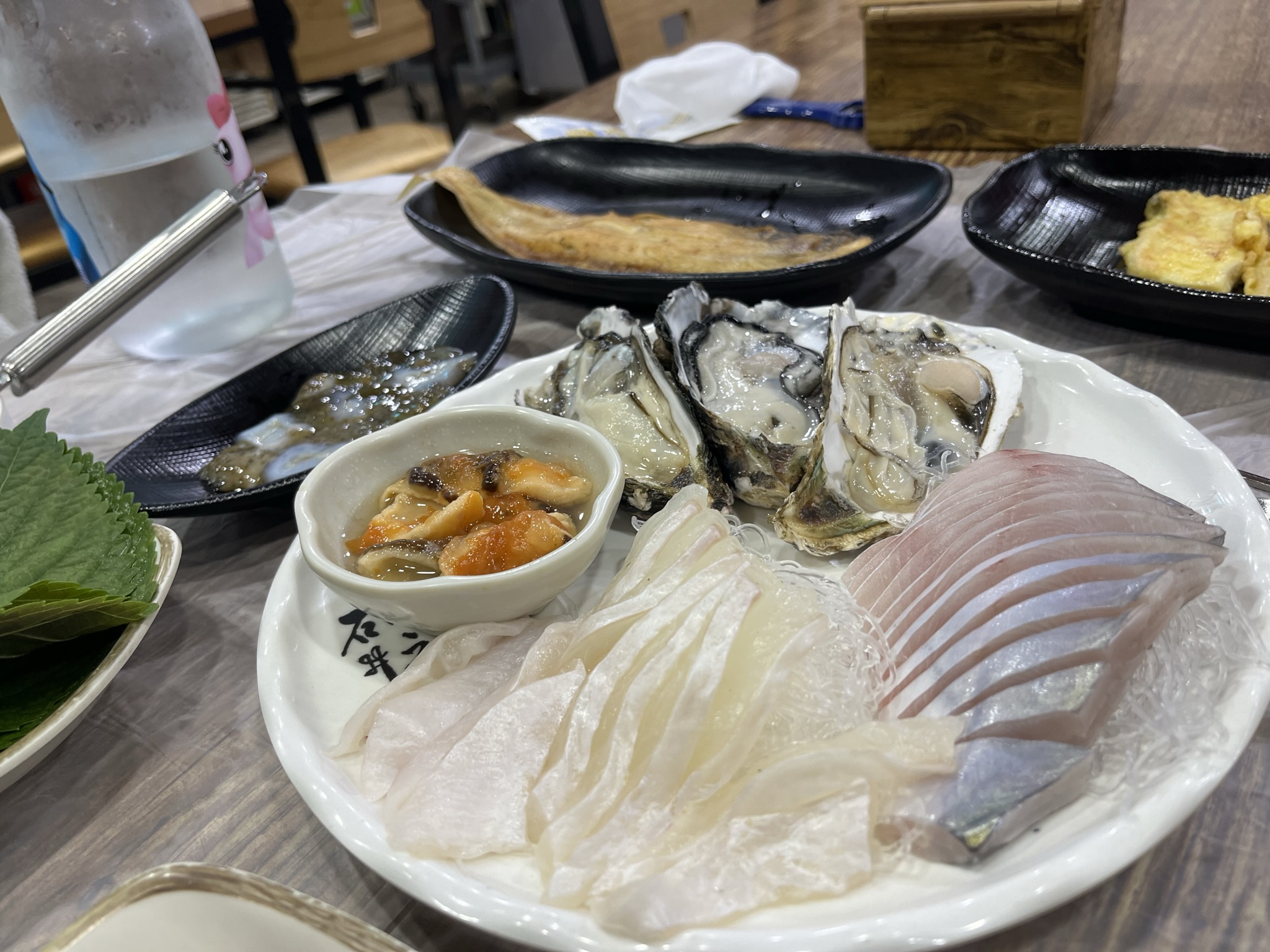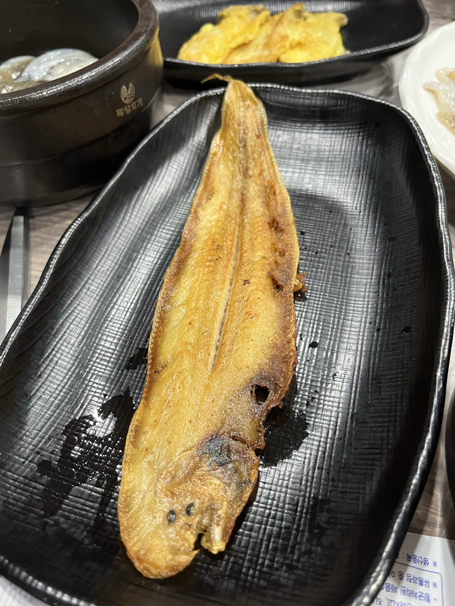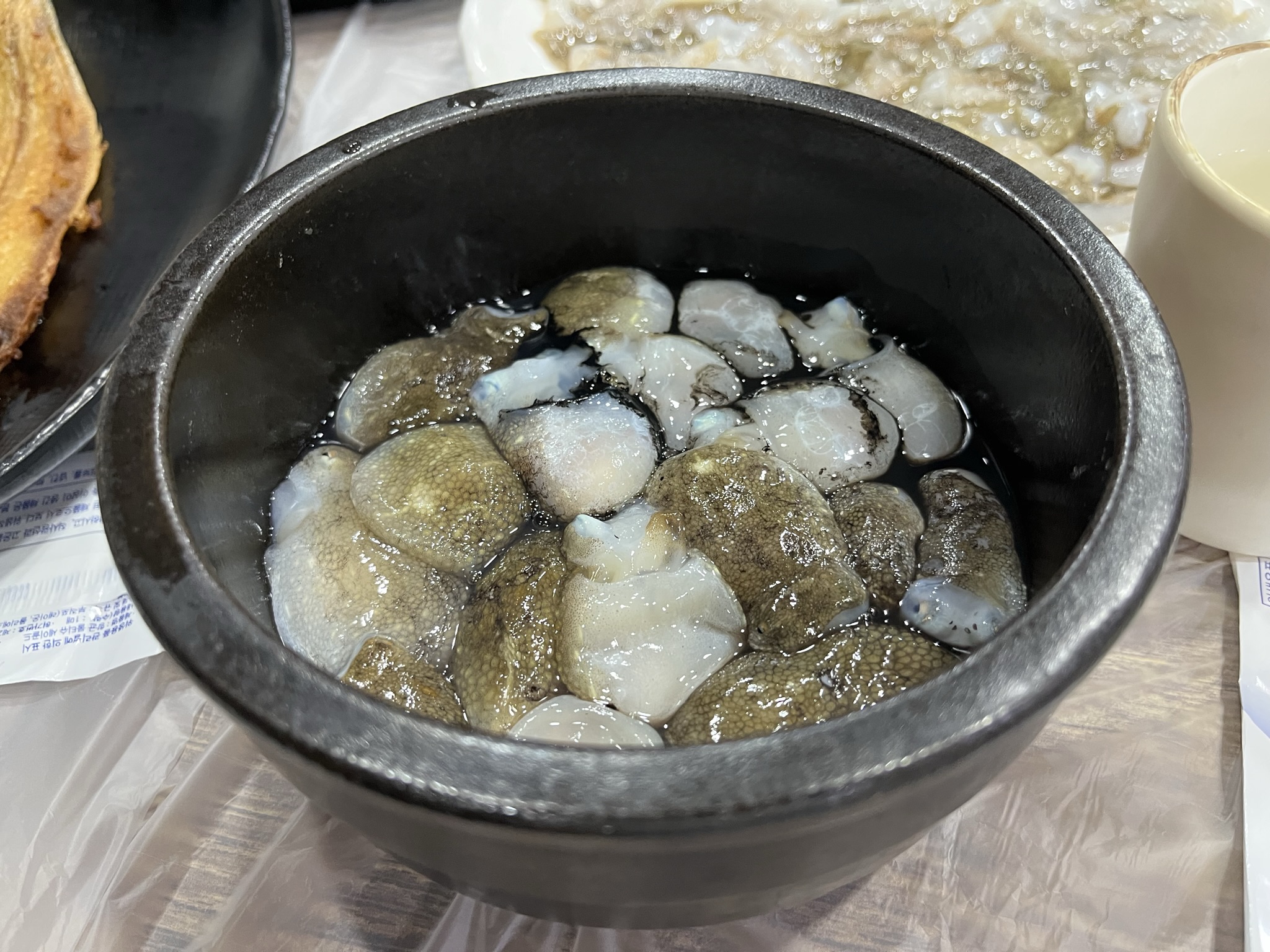 기본 상차림에 광어회, 석화, 멍게 그리고 군산의 자랑인 박대 구이입니다.
