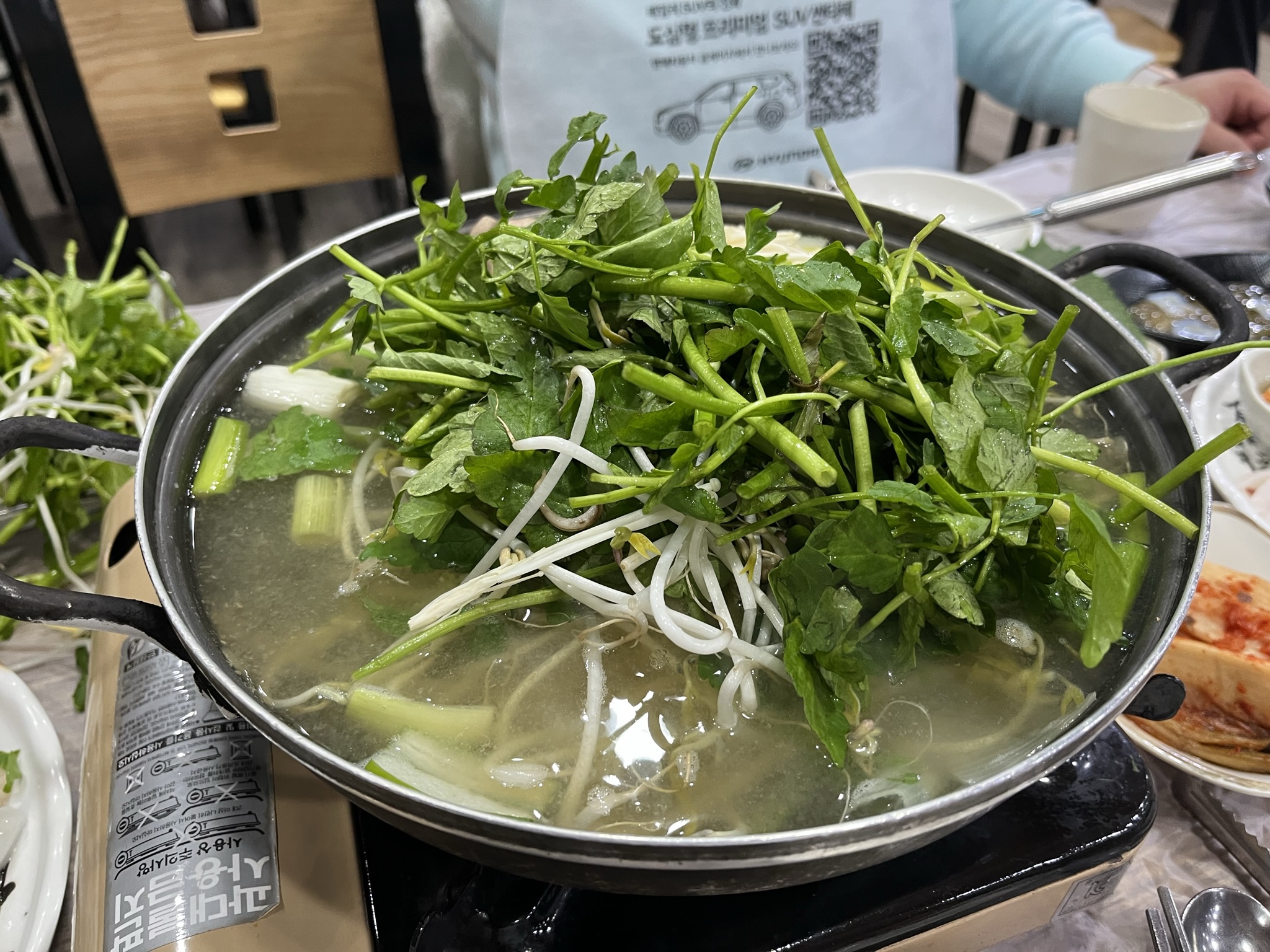 육수가 끓으면 미나리와 숙주를 넣고 끓여준 다음 쭈꾸미를 넣고 먹습니다.