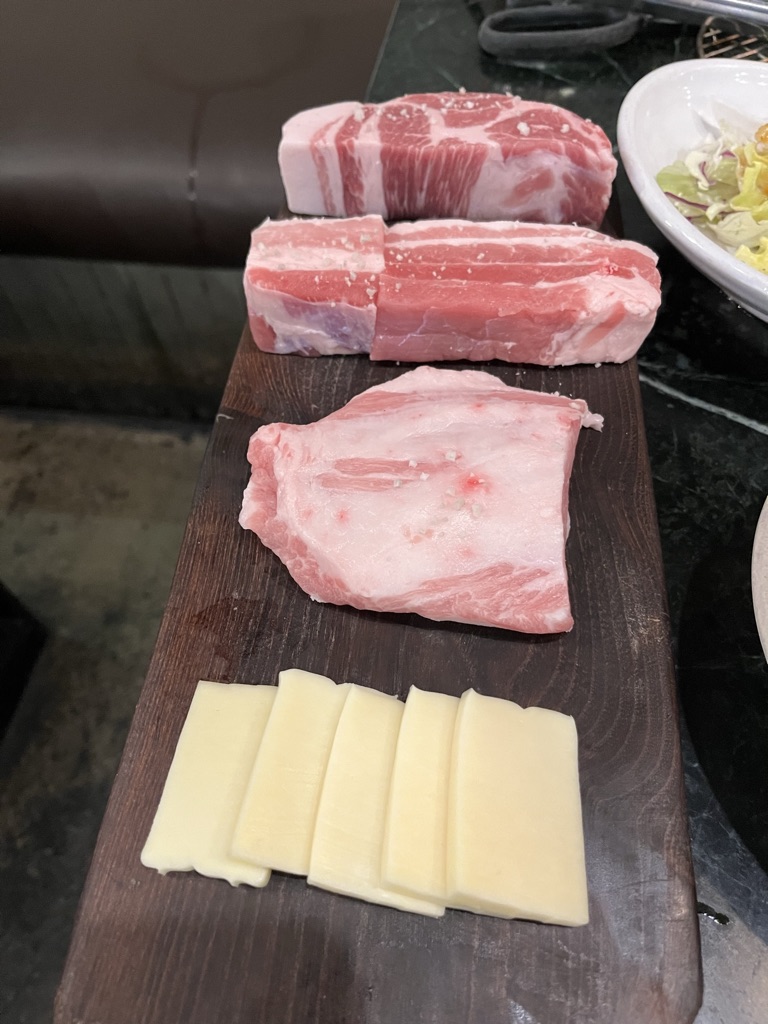 항정살, 목살, 삼겹살과 모짜렐라 치즈가 같이 나옵니다.