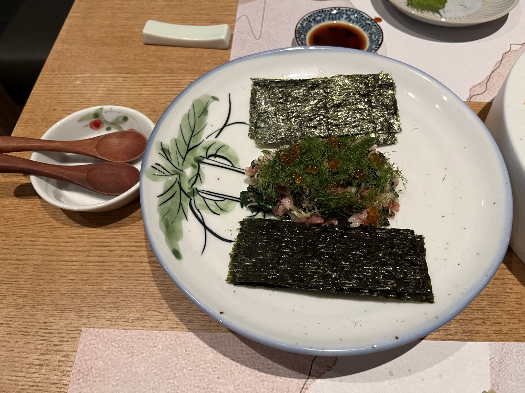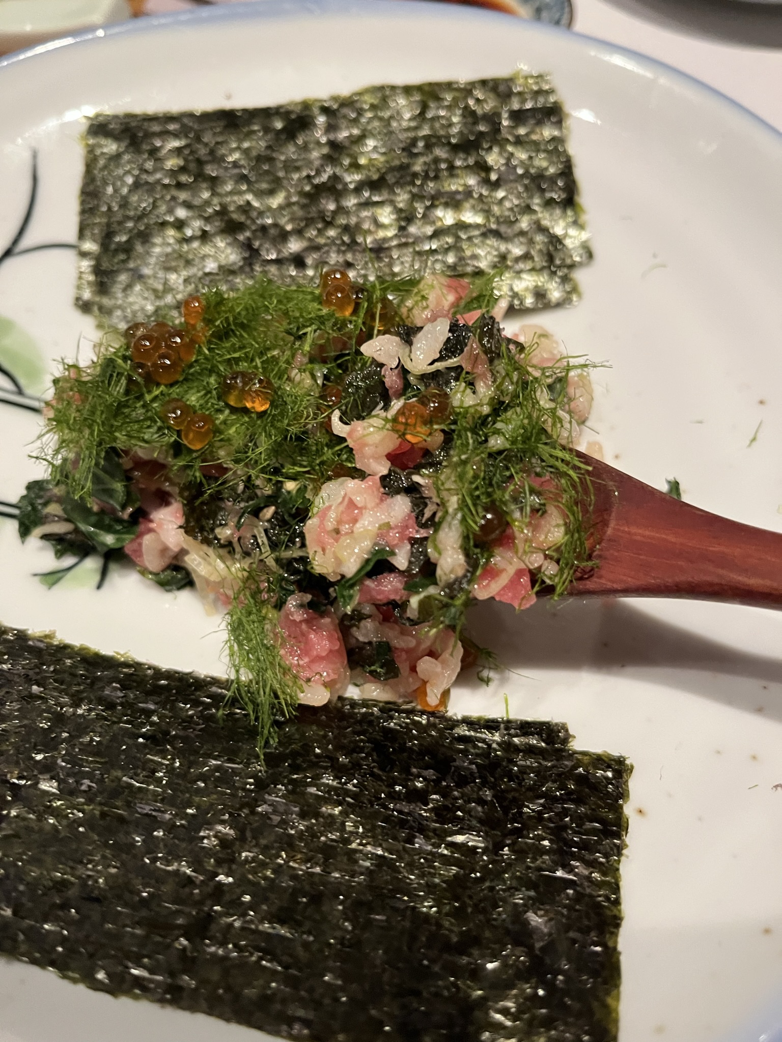 감태를 이용해 관자와 단새우, 참치뱃살과 잘 어우러지게 메뉴 구성을 해주셔서 맛있게 먹었습니다.