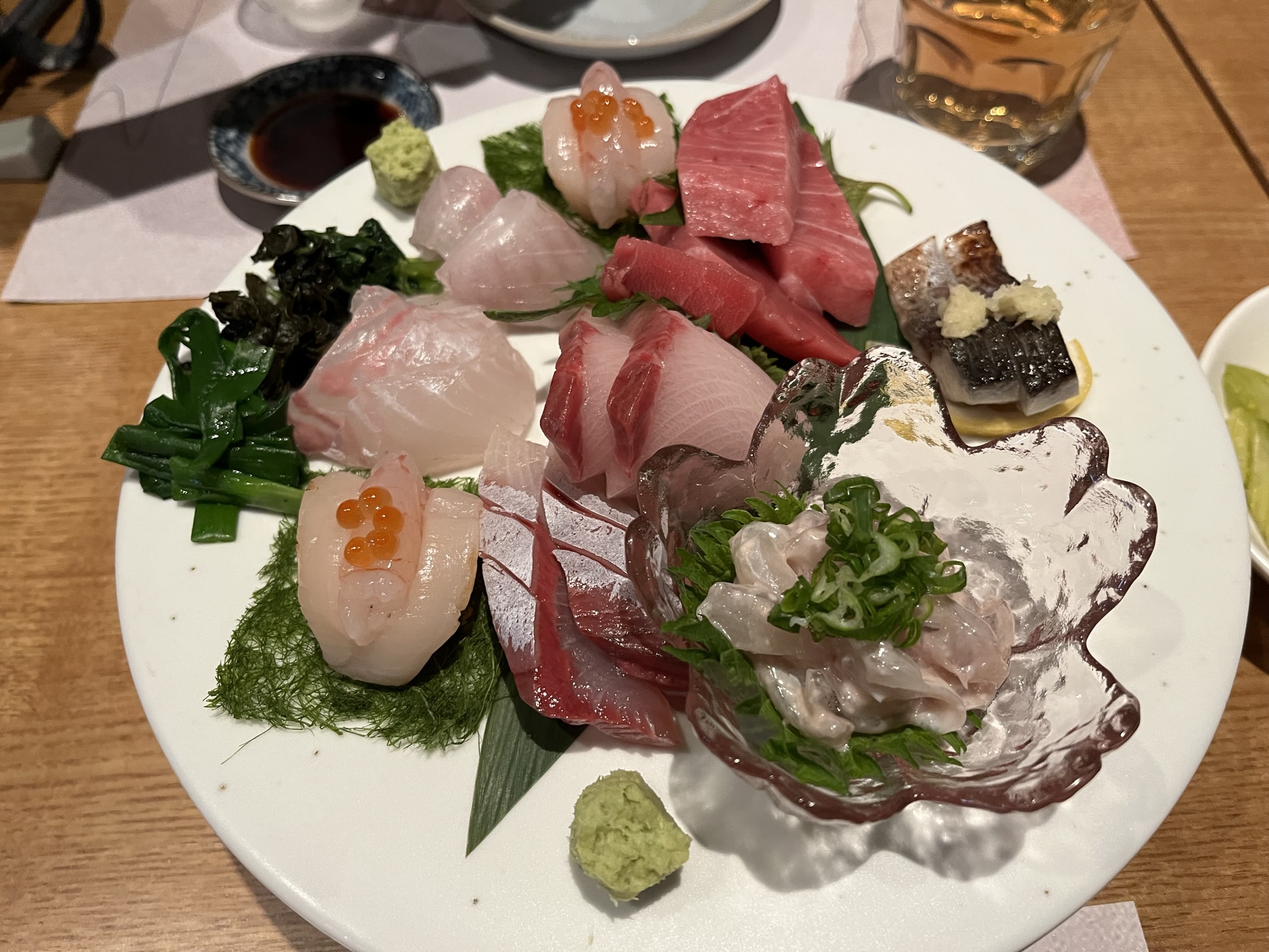 관자, 단새우와 감태, 연어알, 광어, 광어지느러미, 시메사바, 참치, 방어, 쥐치뼈째회가 있었습니다.