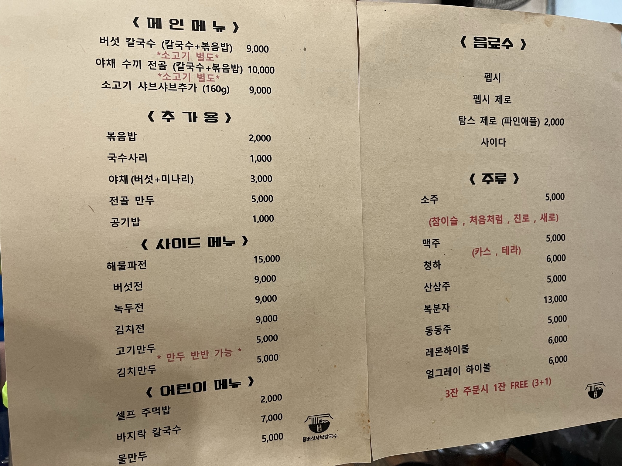 보통 일반적으로 주문하는 스타일은 버섯칼국수(칼국수+볶음밥) 2개, 소고기 샤브샤브 추가(160g) 1개 이렇게 주문합니다.