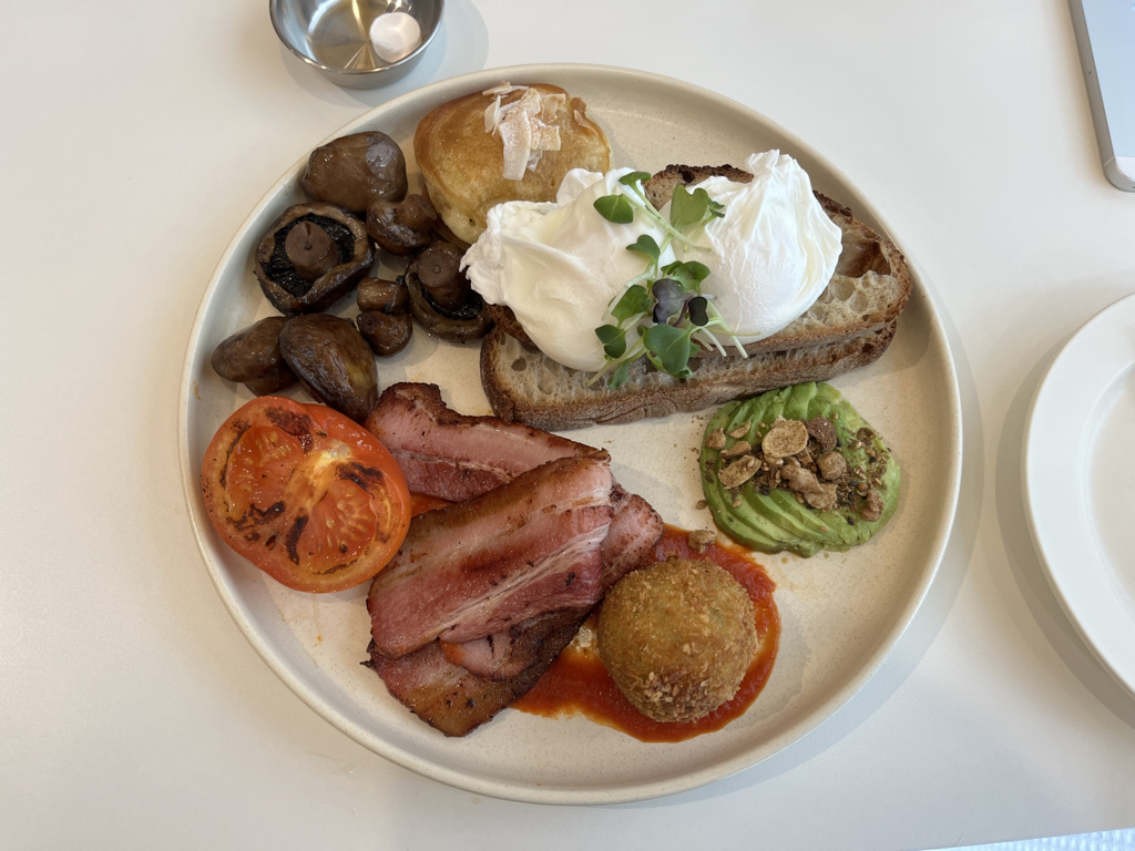 핫케이크, 빵, 수란, 구운 토마토, 구운 양송이버섯, 구운 베이컨, 아보카도, 크로켓이 있었습니다.