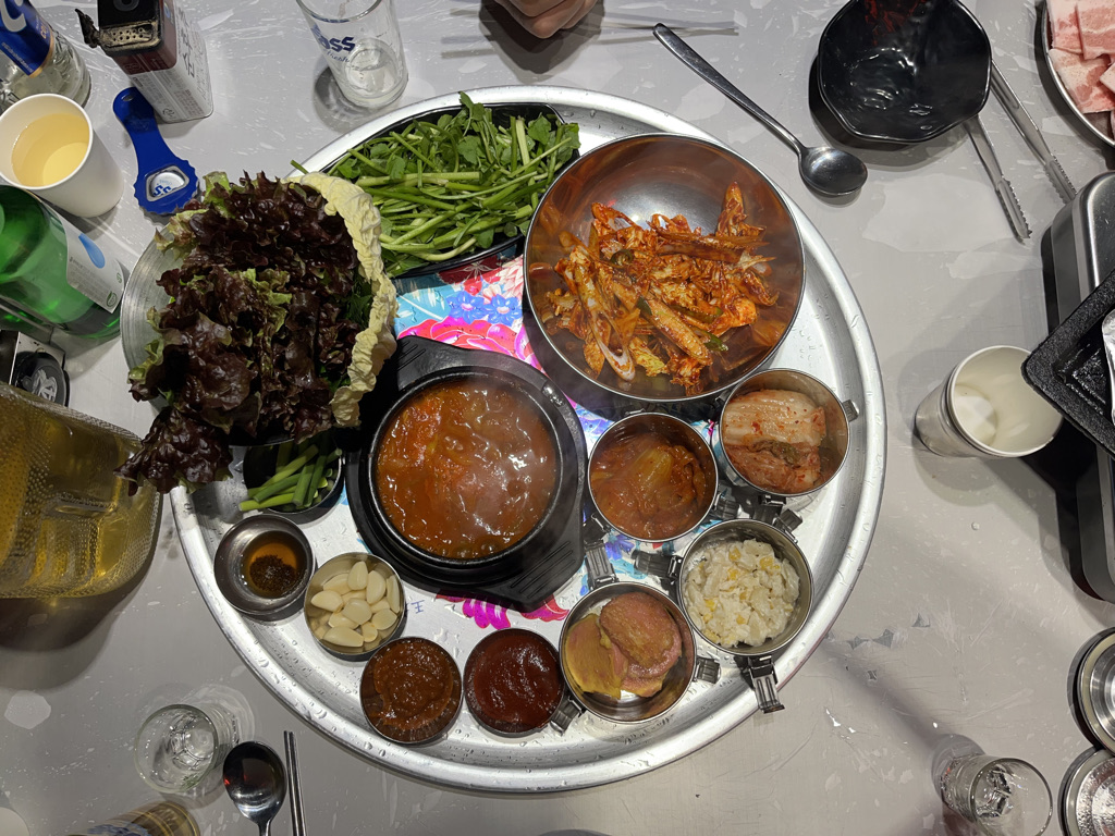 배추, 상추, 깻잎, 기름장, 미나리, 마늘, 쌈장, 고추장 등등~~