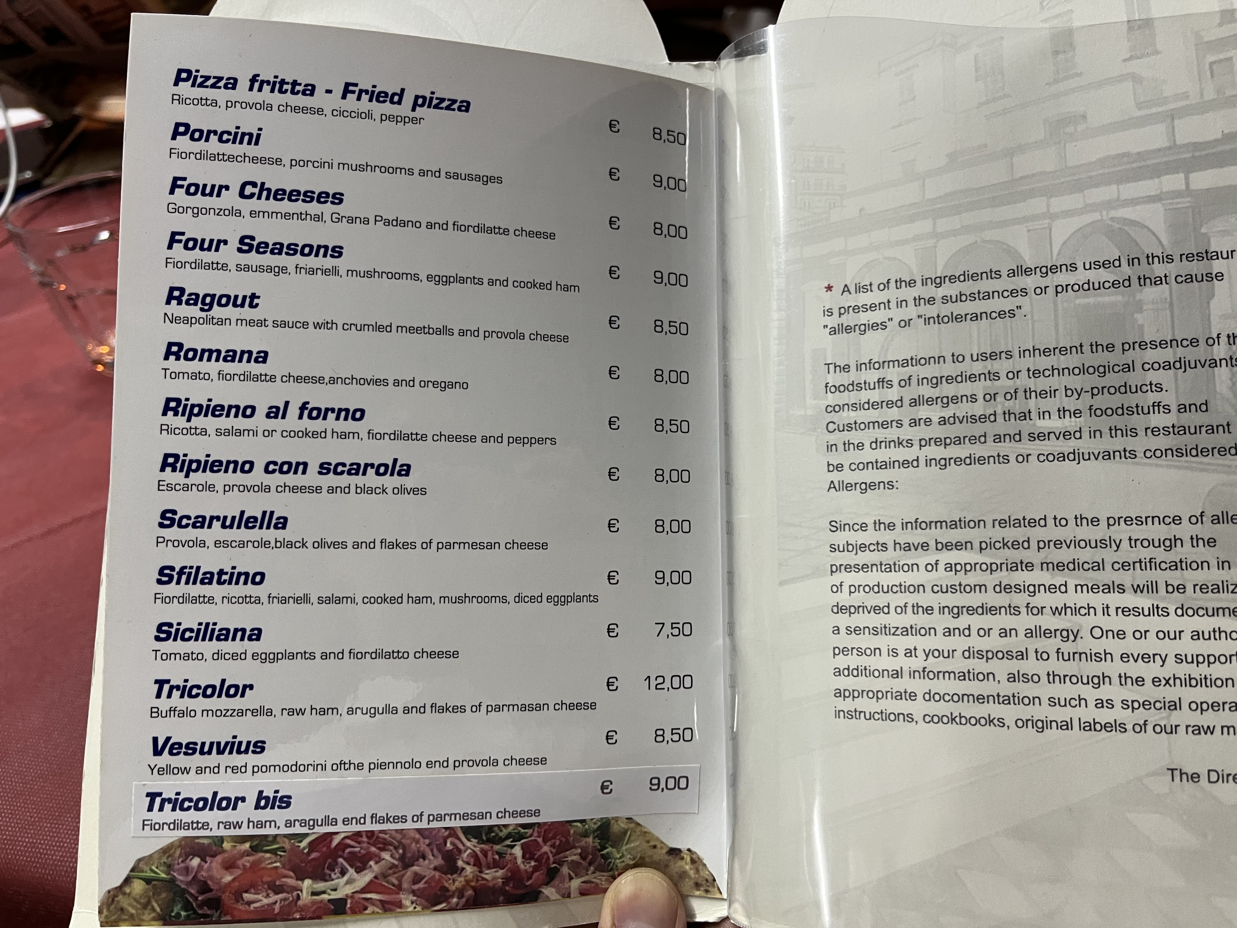 피자 메뉴 대부분 가격은 10유로 정도입니다.