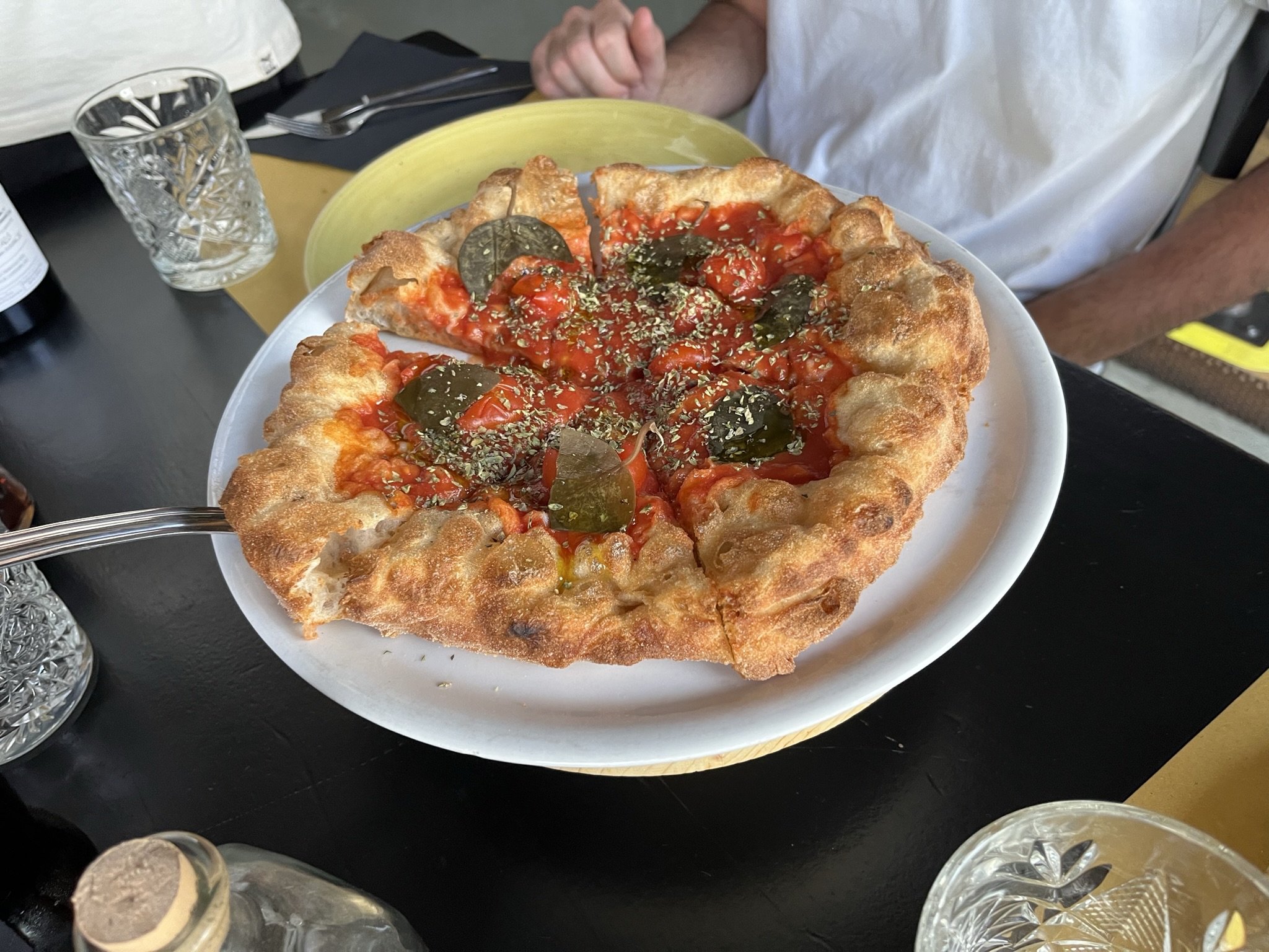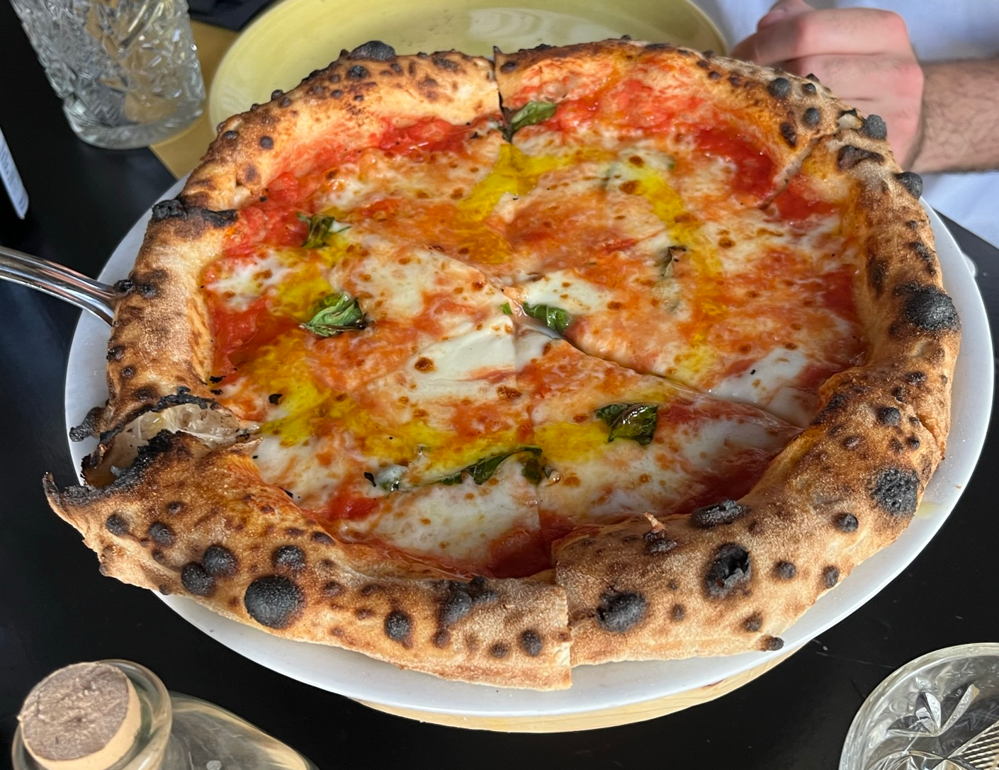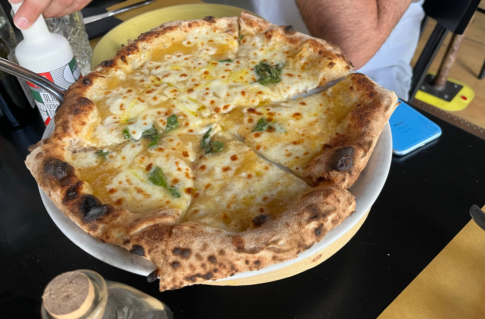 피자를 테이블로 가져온 후 셰프님이 올리브오일을 뿌려줍니다.