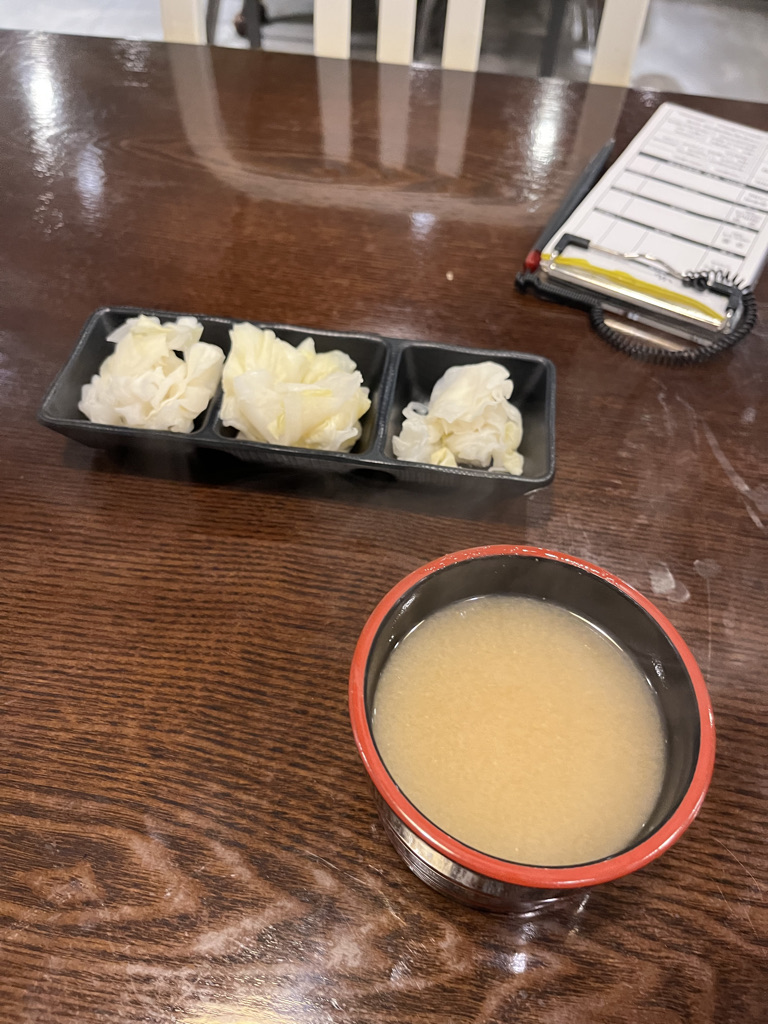 셀프코너에선 깍두기, 단무지, 양배추 절임, 장국과 밥이 있습니다.