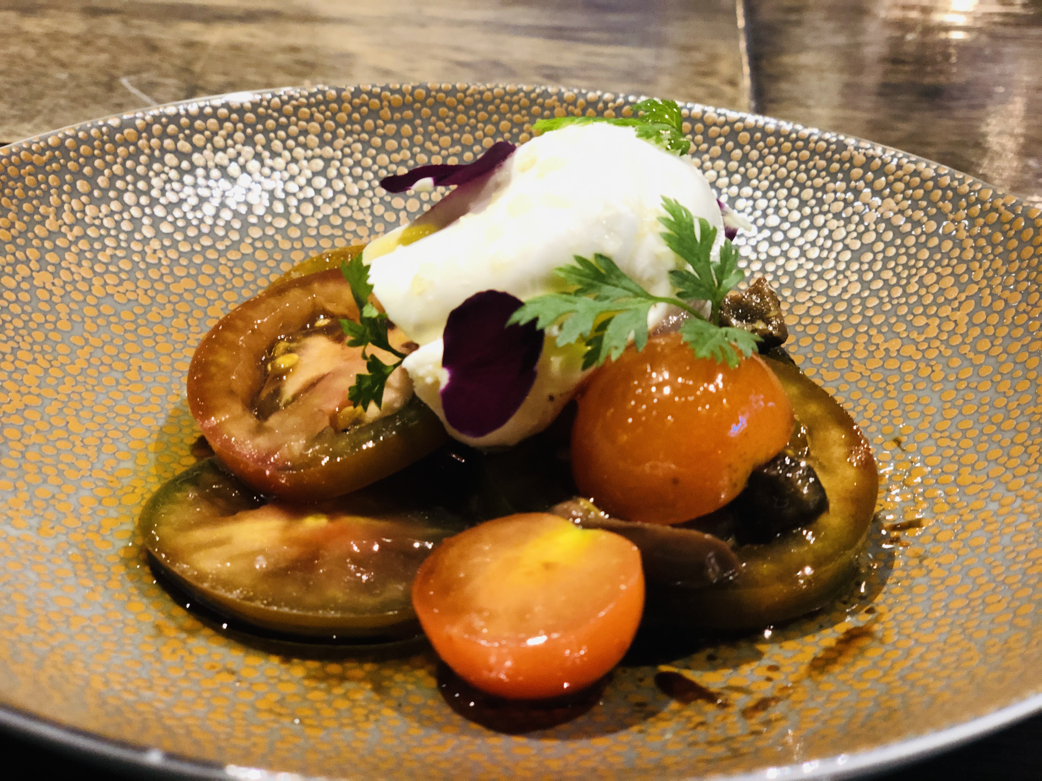 다양한 토마토와 쉐리 비네거, 부라타 치즈가 올라간 요리입니다.