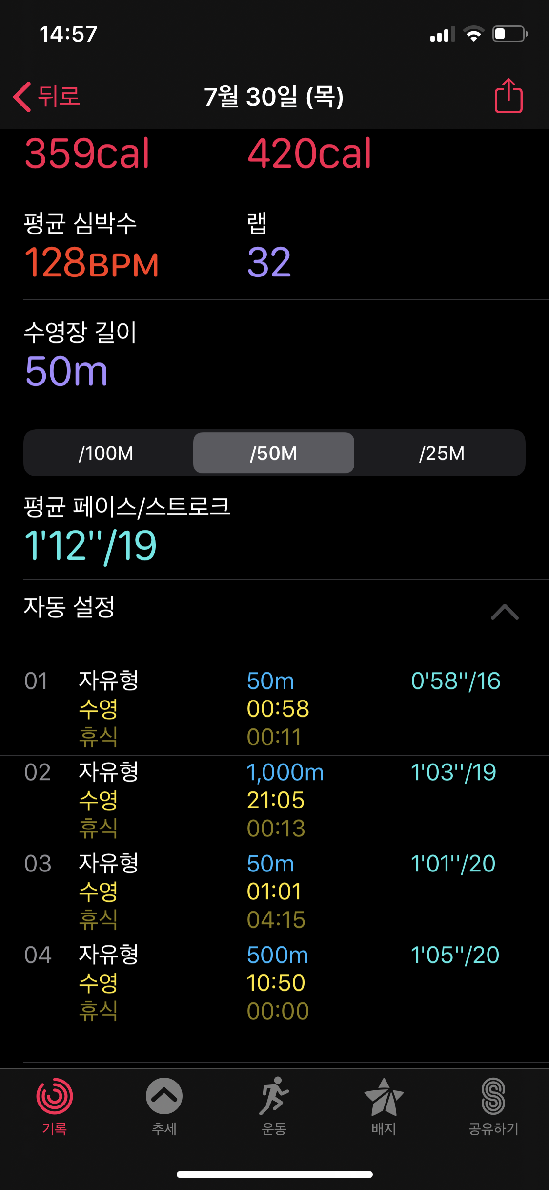이렇게 애플 워치에서 저의 수영을 감시해주니 신경 쓰여서 열심히 할 수밖에 없더군요.