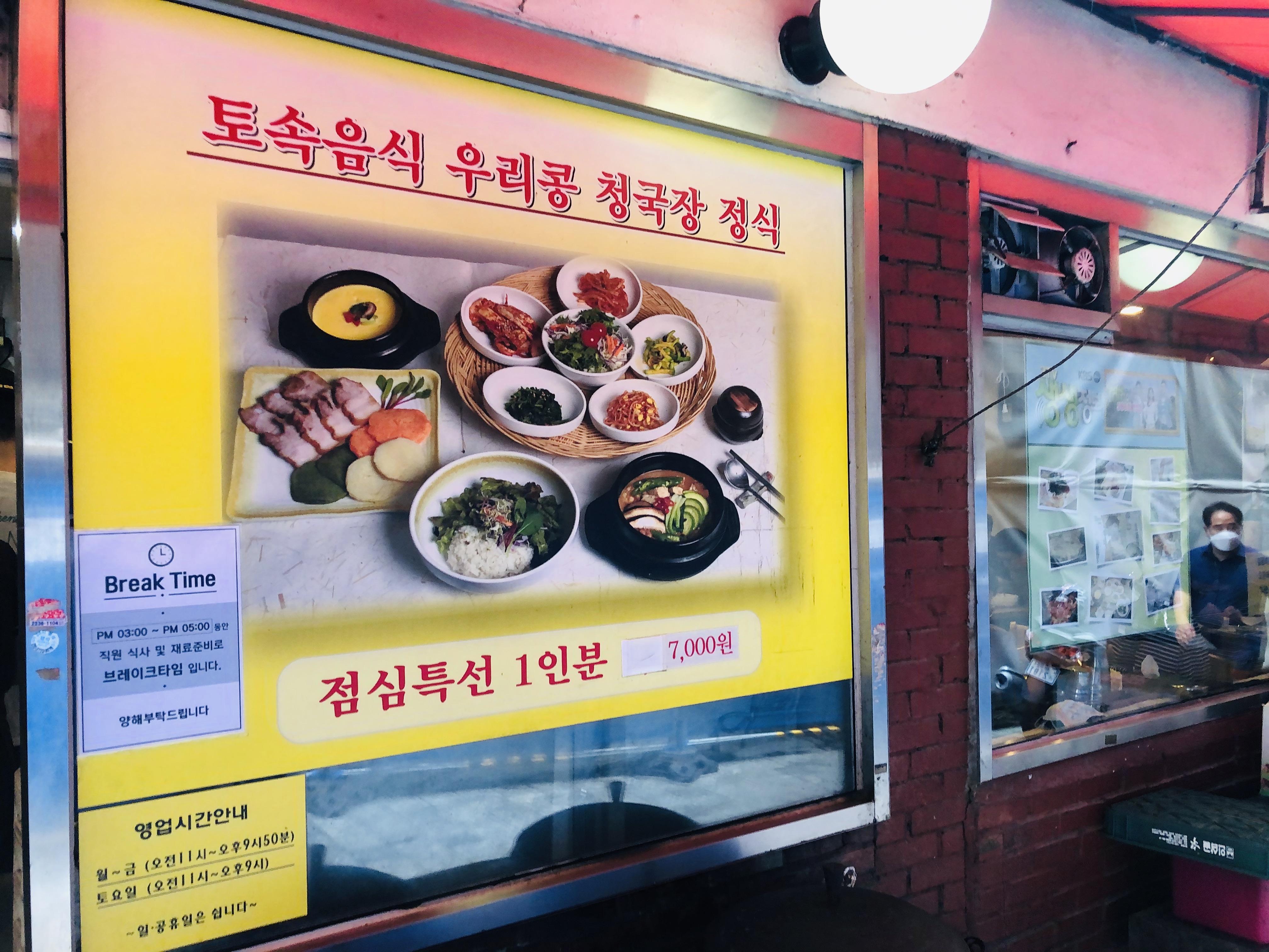 앞에는 메뉴가 나와 있습니다. 점심 메뉴는 청국장 정식으로 딱 1개입니다.