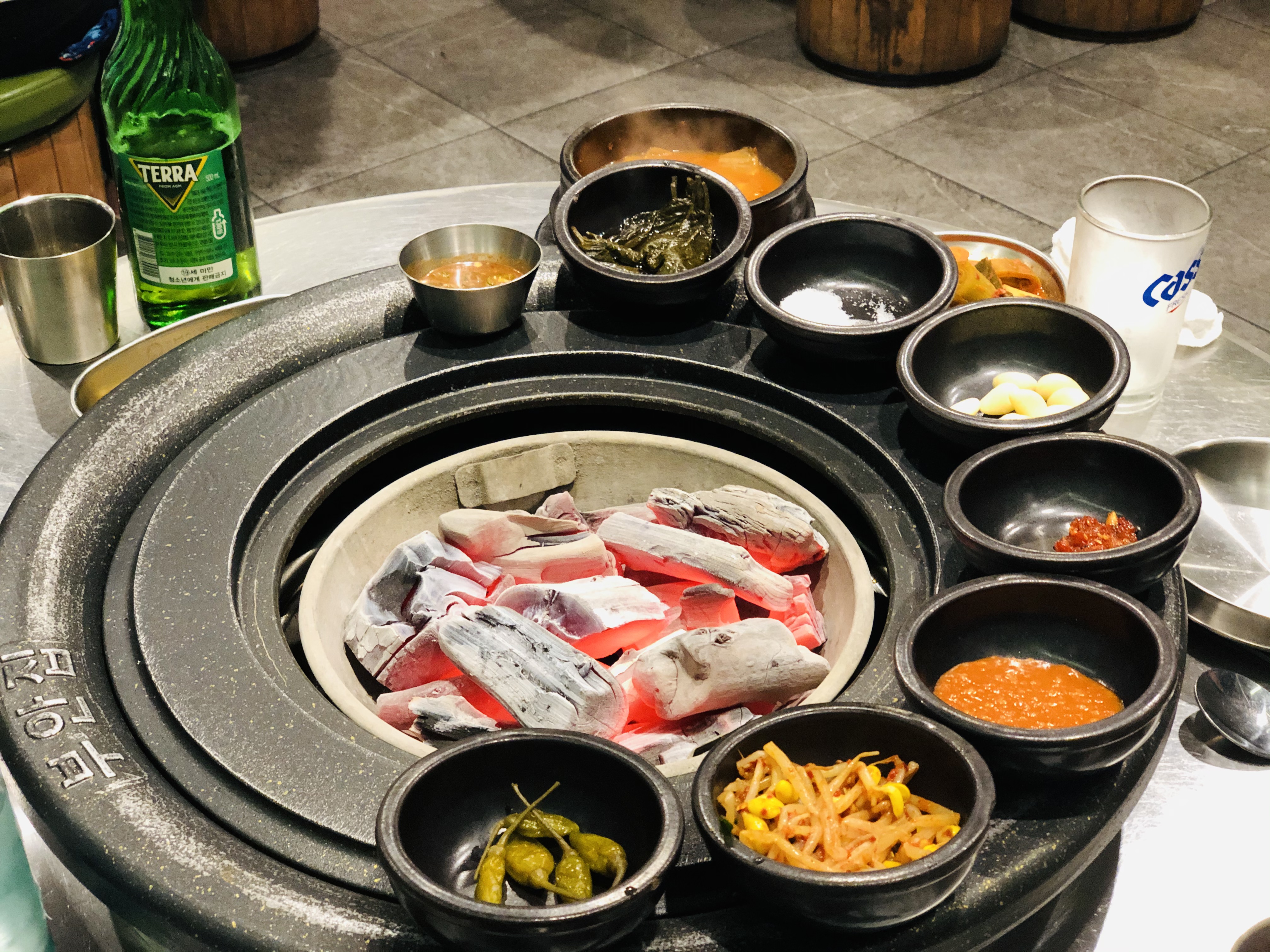 이렇게 숯불과 반찬들이 나왔습니다. 파김치는 불판에 구워서 먹을거구요.