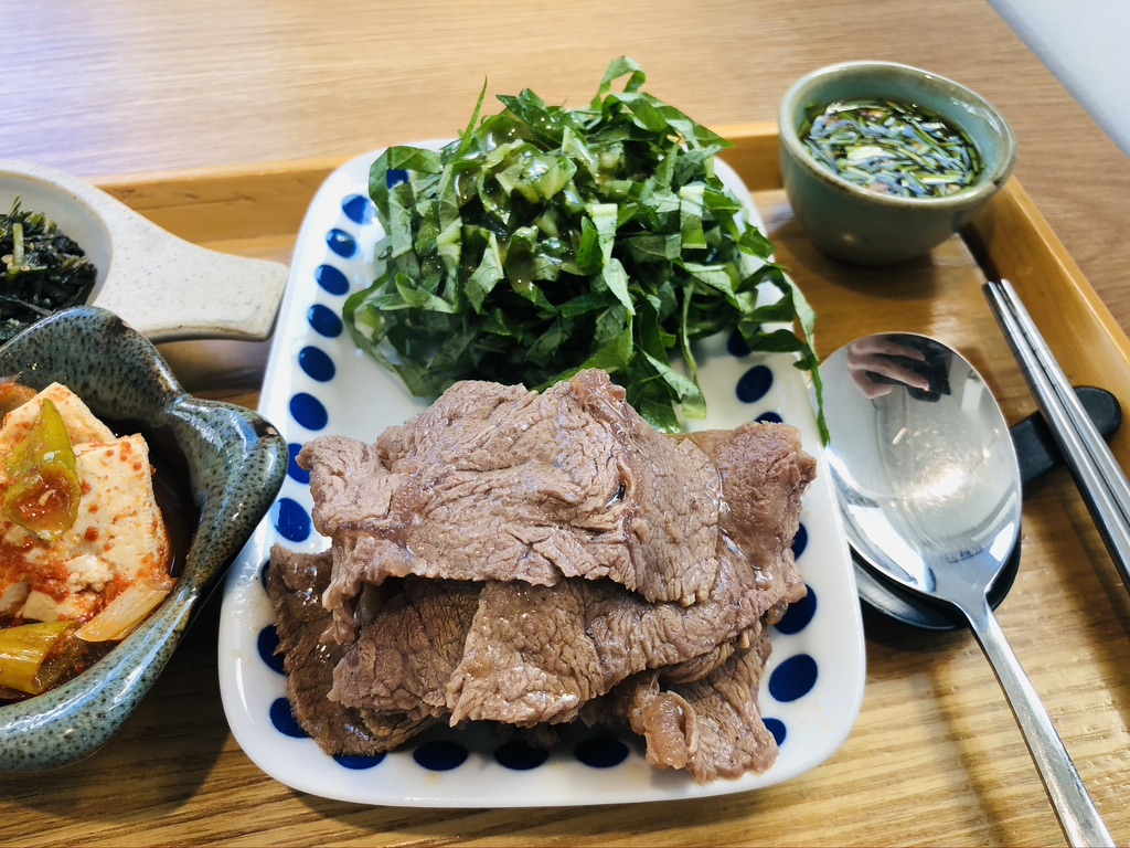 (왼쪽부터) 고들빼기, 김치 취나물, 두부조림, 부챗살과 간단한 깻잎무침이 있습니다.