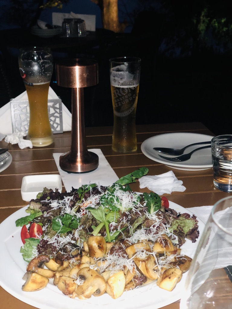 저희는 버섯 샐러드, 볼로네제 파스타, 봉골레 파스타, 뽈로 알루이스 리조또, 루꼴라 피자 그리고 페로니 생맥주를 주문했습니다.