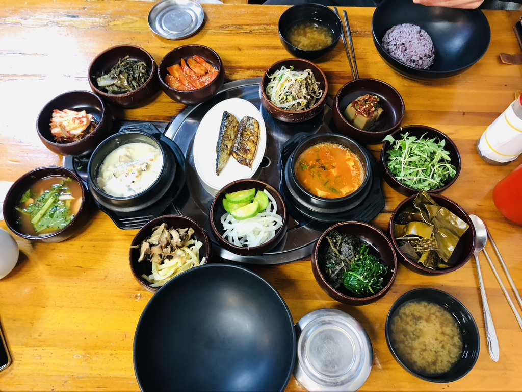 여러 가지 나물, 더덕구이, 콩비지, 된장찌개, 꽁치구이, 도라지와 표고버섯까지..