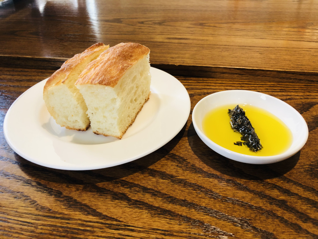 두툼한 식전 빵과 올리브 오일에 다진 블랙 올리브가 들어가 있습니다.