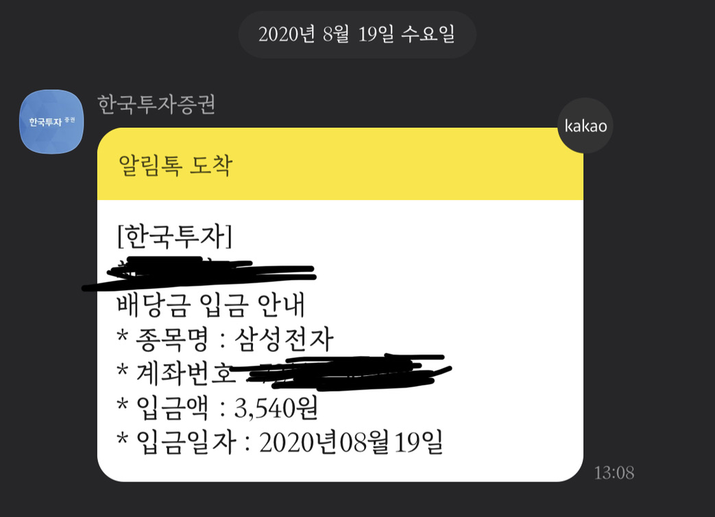 저에게 배당금은 8월 19일에 입금되었으며 8월 19일 기준으로 삼성전자의 주가는 주당 59,000원 정도였고요.