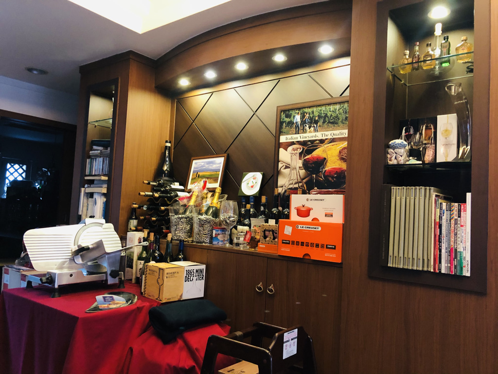 여러 와인병과 햄 슬라이서 그리고 책들이 있습니다.