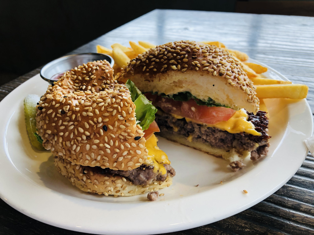 햄버거 반절을 갈라보니 로메인, 토마토, 체다치즈 그리고 패티가 보이네요!