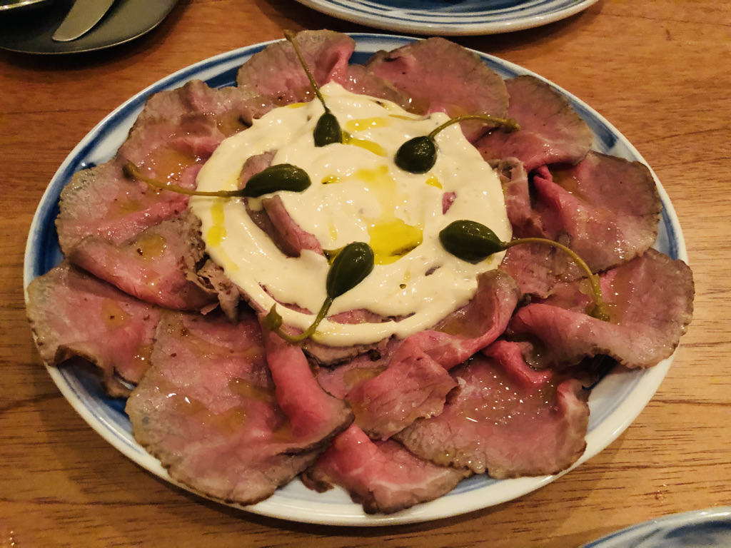 한우 타다끼에 참치 마요네즈, 엑스트라 버진 올리브 오일, 케이퍼 베리입니다.