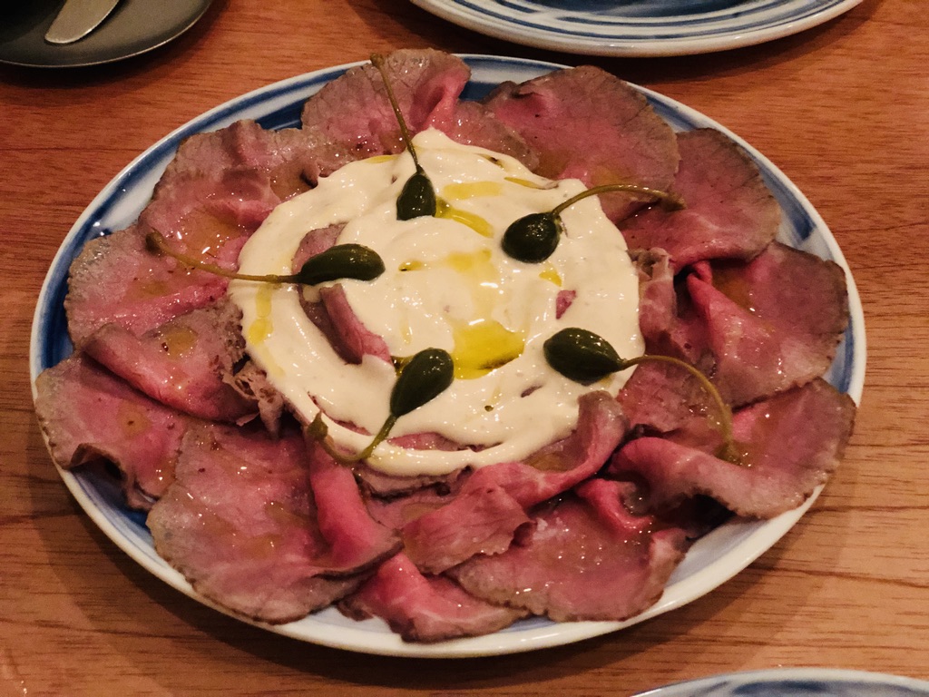 한우 타다끼에 참치 마요네즈, 엑스트라 버진 올리브 오일, 케이퍼 베리입니다.