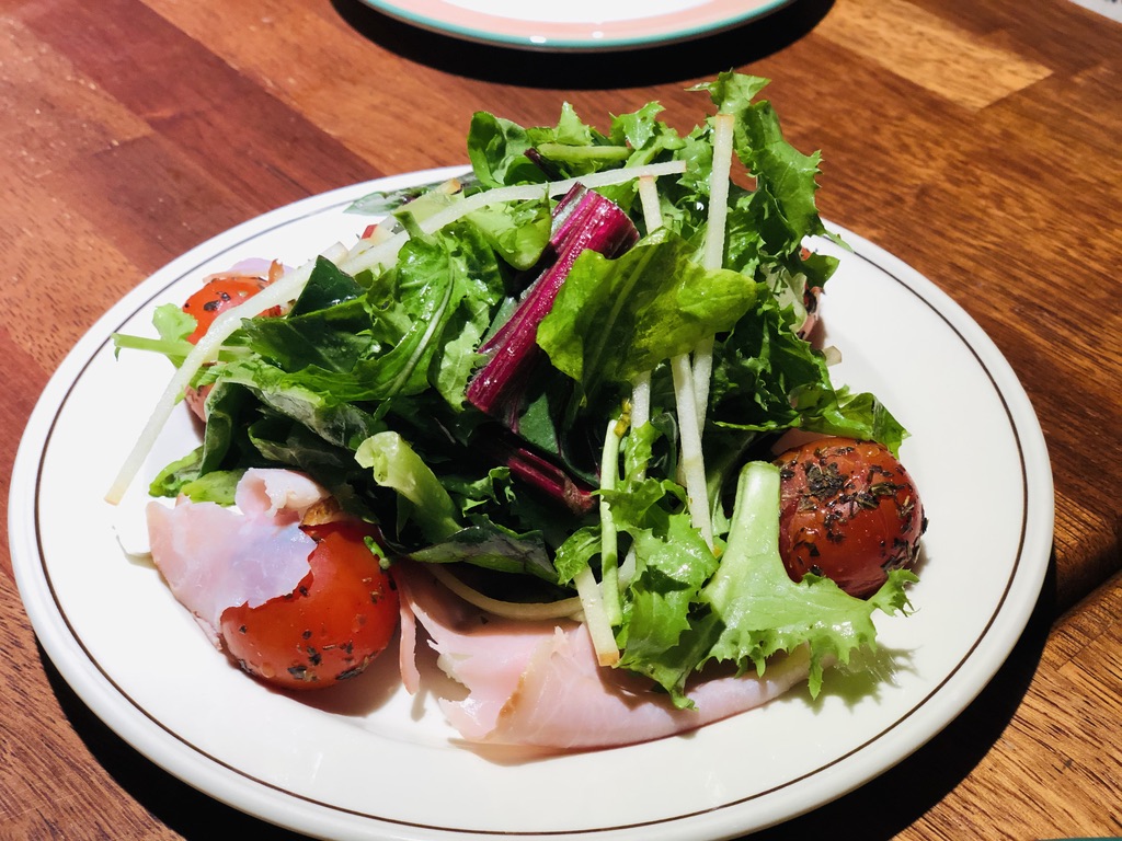 훈연 향을 입힌 토마토, 루꼴라, 허니 햄, 모짜렐라 샐러드인데요.